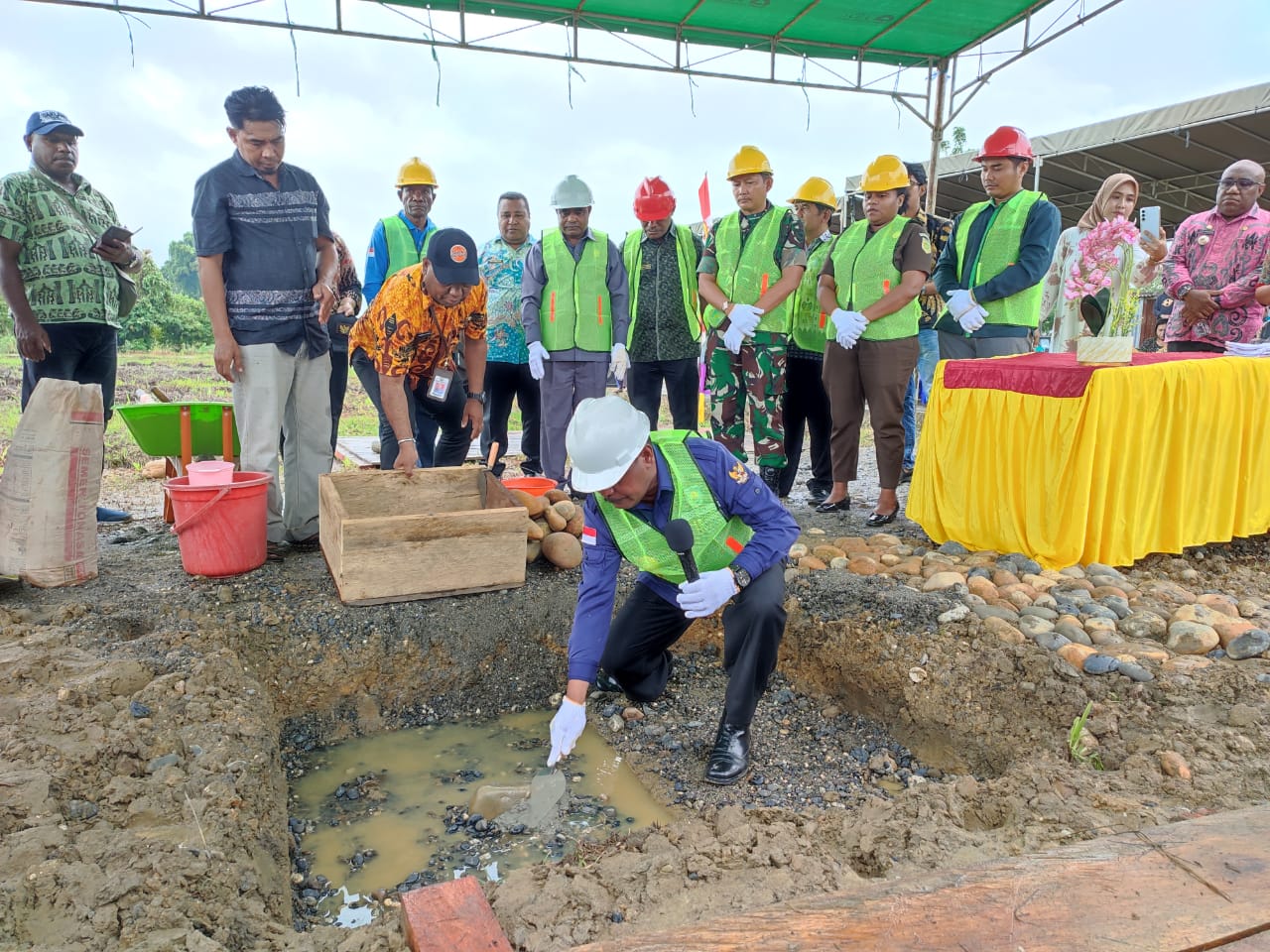 Bupati Teluk Bintuni, Dr. Ir. Petrus Kasihiw, MT,. Meletakan batu pertama pembangunan SMAN 2 Bintuni
