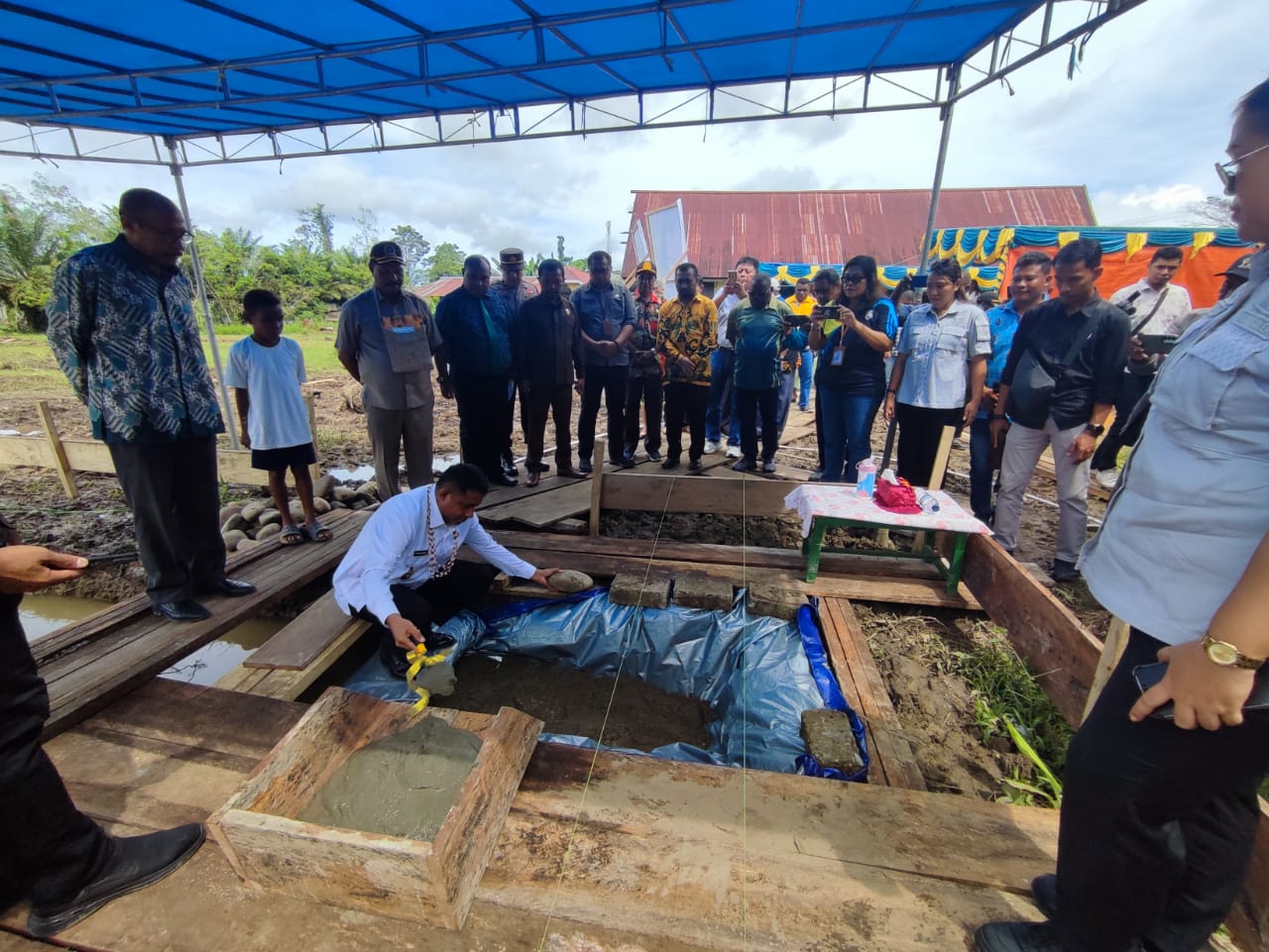 Nampak Bupati Teluk Bintuni, Yohanis Manibuy, SS., MH., meletakan batu pertama pembangunan SMP Advent di kampung Idut. (Foto/Susi)