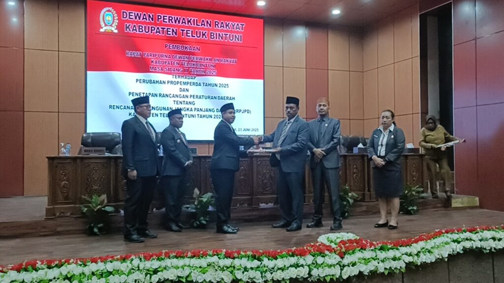 “Saya serahkan Ranperda RPJPD ini kepada DPRK Teluk Bintuni untuk dibahas lebih lanjut sesuai mekanisme peraturan perundang-undangan yang berlaku. Semoga dokumen ini menjadi panduan yang visioner dan aplikatif bagi pembangunan Teluk Bintuni ke depan,”. Ucap Bupati - Rapat Paripurna ini diharapkan menjadi tonggak penting dalam mewujudkan pembangunan daerah yang merata, inklusif, dan berkelanjutan menuju visi Teluk Bintuni 2045. (Susi)