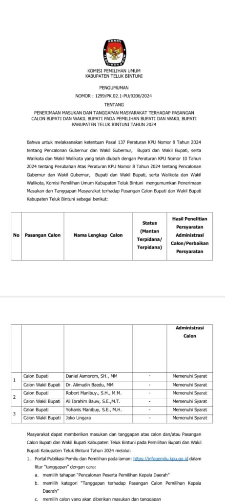 DPRD Teluk Bintuni Gelar Rapat Paripurna Terhadap Raperda Pertanggungjawaban Pelaksanaan APBD Tahun Anggaran 2023 Pengumuman Hasil Penelitian Persyaratan Administrasi Calon Bupati dan Wakil Bupati Dalam Pemilihan Kepala Daerah Kabupaten Teluk Bintuni Tahun 2024
