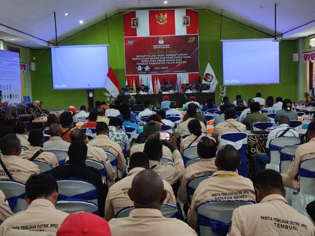 BINTUNI,suarateluk.com – Komisi Pemilihan Umum (KPU) Teluk Bintuni gelar rapat pleno terbuka rekapitulasi penghitungan perolehan suara dan penetapan hasil pemilihan umum Tahun 2024 tingkat Kabupaten Teluk Bintuni, Jumat (1/3/2024).