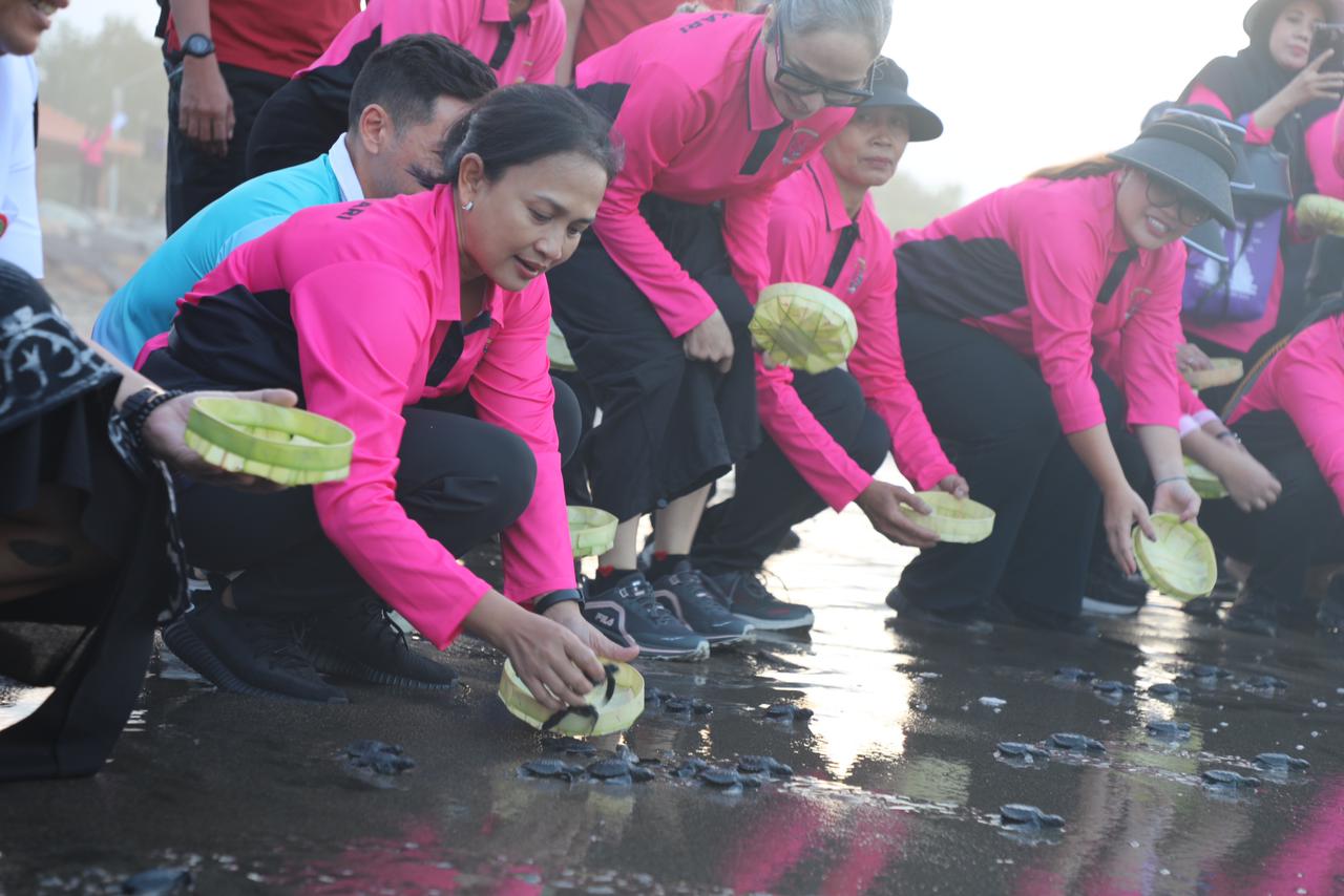 Ketua Umum Bhayangkari, Ny. Juliati Sigit Prabowo bersama Kapolda Bali Irjen. Pol. Ida Bagus Kade Putra Narendra, S.I.K., M.Si., Ketua Bhayangkari Daerah Bali, Ny. Ira Ida Bagus dan Bupati Tabanan, I Komang Gede Sanjaya dan Forkopimda Kabupaten Tabanan, turun langsung melepas tukik tersebut.