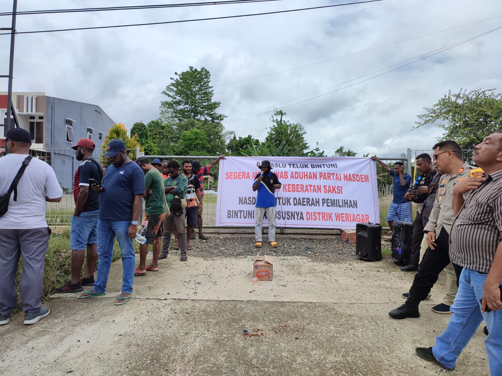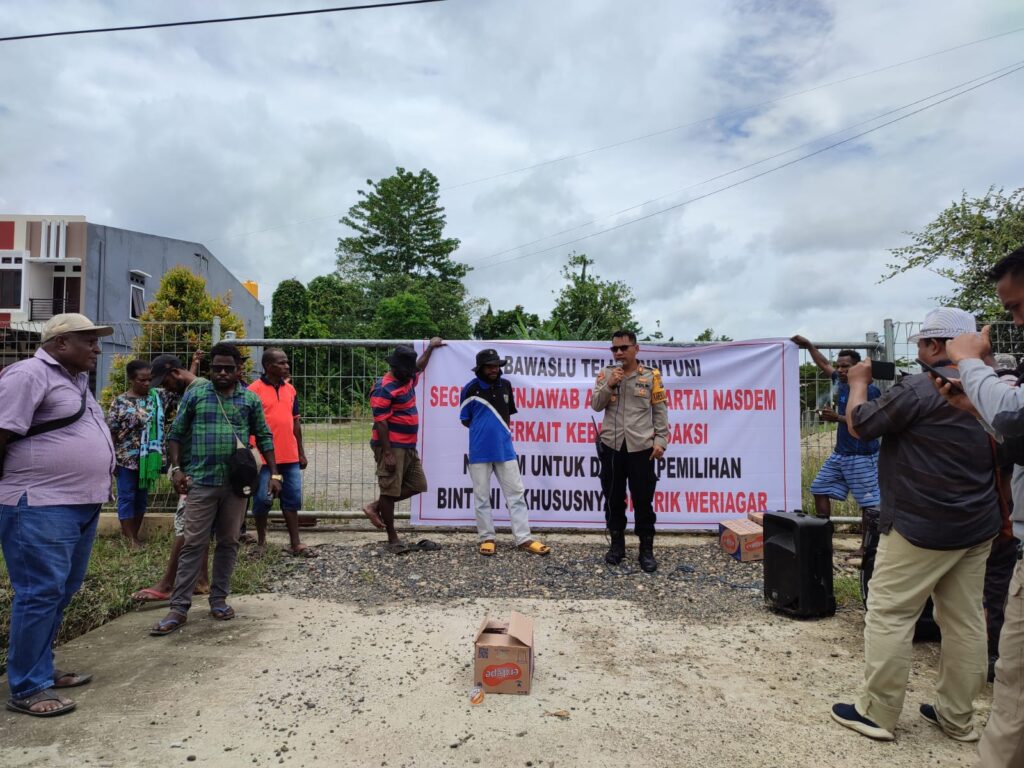 Dalam aksi yang dikawal sejumlah personil polisi ini, mereka menuntut pembetulan rekapitulasi perolehan suara Pemilu 2024 di Distrik Weriagar.