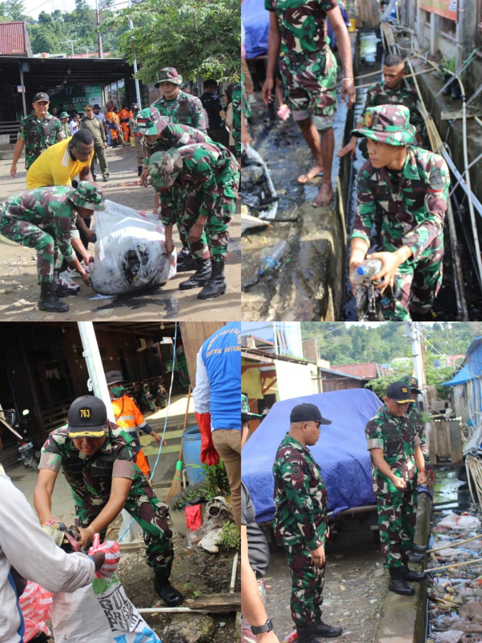 Danyonif 763/SBA Letkol Inf Imam Purwoko, S.E. M.H.I., bersama Prajurit Yonif 763/SBA dengan penuh semangat bergotong royong membersihkan sampah yang berserakan di lingkup Pasar Sentral Bintuni.