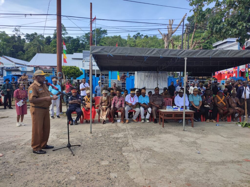 Plt. Sekretaris Teluk Bintuni, Frans N Awak. Saat memberikan sambutan di acara parade Truk Budaya 7 Suku asli Kabupaten Teluk Bintuni. (Foto/Susi)