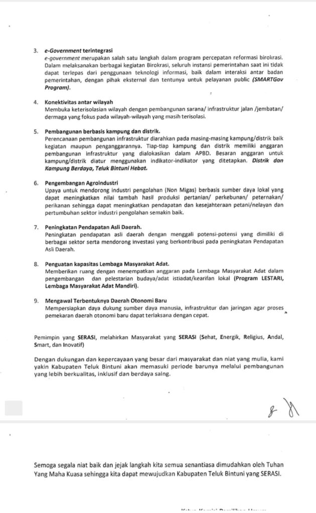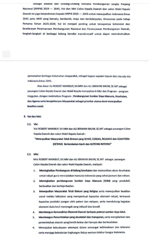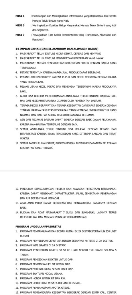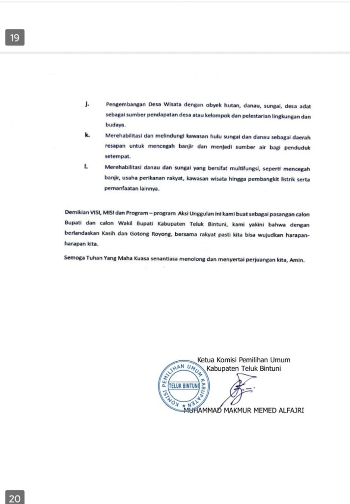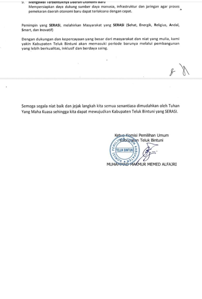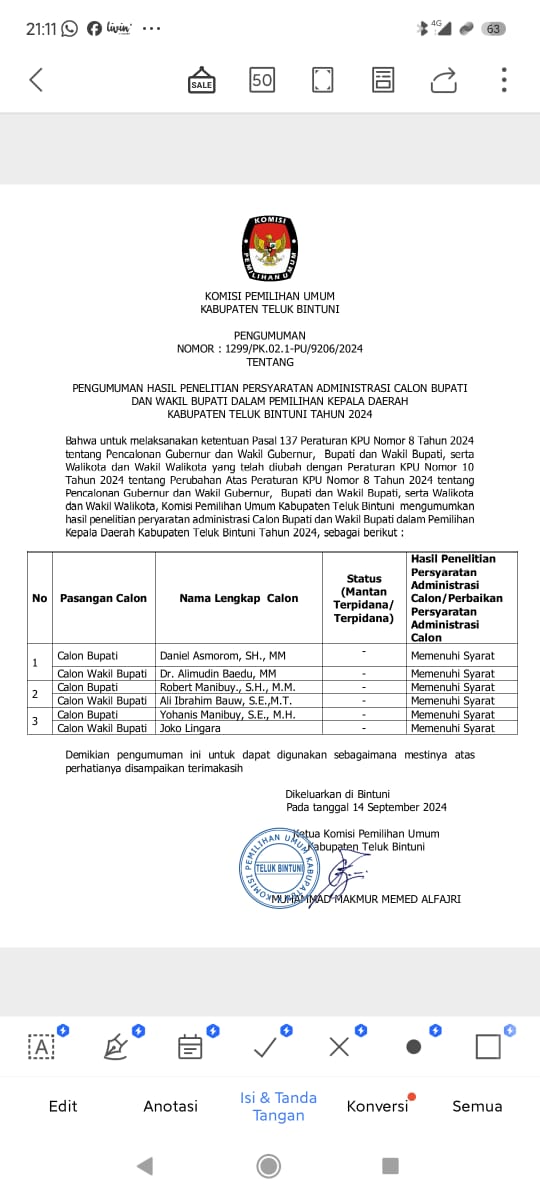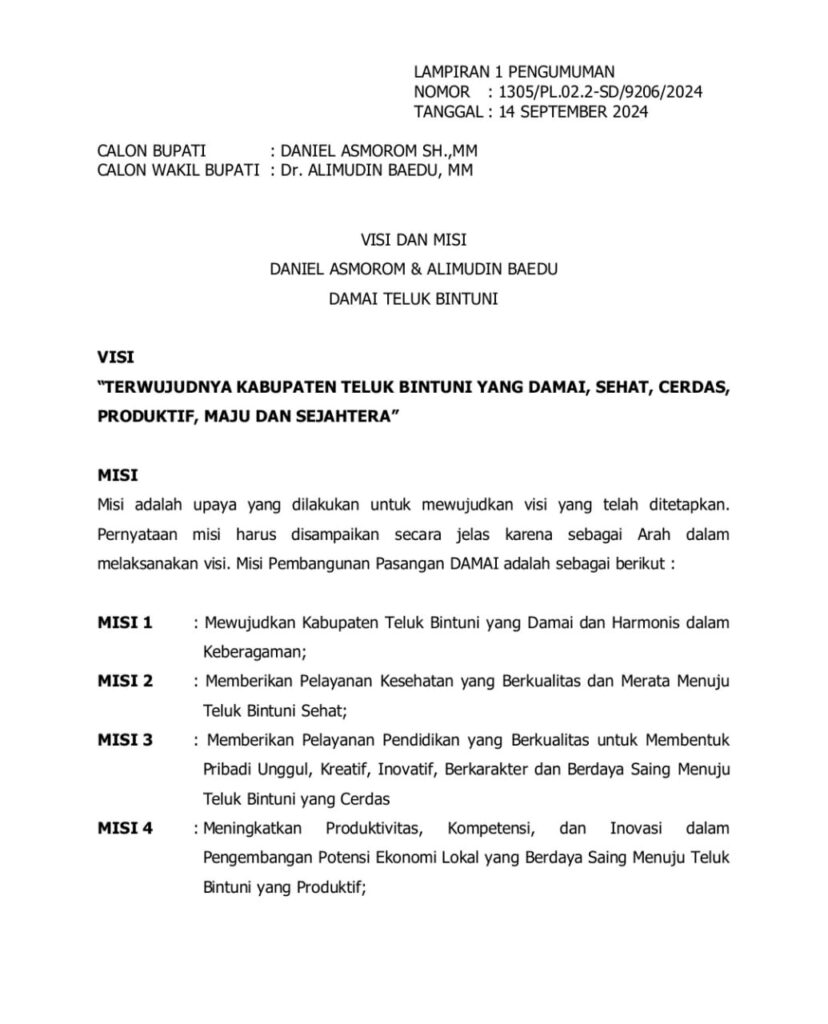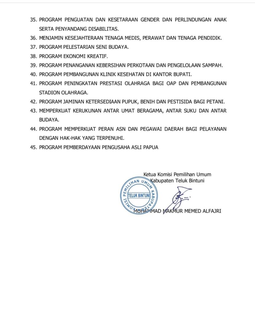 BINTUNI.SuaraTeluk.com – Bahwa untuk melaksanakan ketentuan Pasal 137 Peraturan KPU Nomor 8 Tahun 2024 tentang Pencalonan Gubernur dan Wakil Gubernur, Bupati dan Wakil Bupati, serta Walikota dan Wakil Walikota yang telah diubah dengan Peraturan KPU Nomor 10 Tahun 2024 tentang Perubahan Atas Peraturan KPU Nomor 8 Tahun 2024 tentang Pencalonan Gubernur dan Wakil Gubernur, Bupat dan Wakil Bupati, serta Walikota dan Wakil Walikota, Komisi Pemilihan Umum Kabupaten Teluk Bintuni mengumumkan hasil penelitian peryaratan administrasi Calon Bupati dan Wakil Bupati dalam Pemilihan Kepala Daerah Kabupaten Teluk Bintuni Tahun 2024, sebagai berikut :