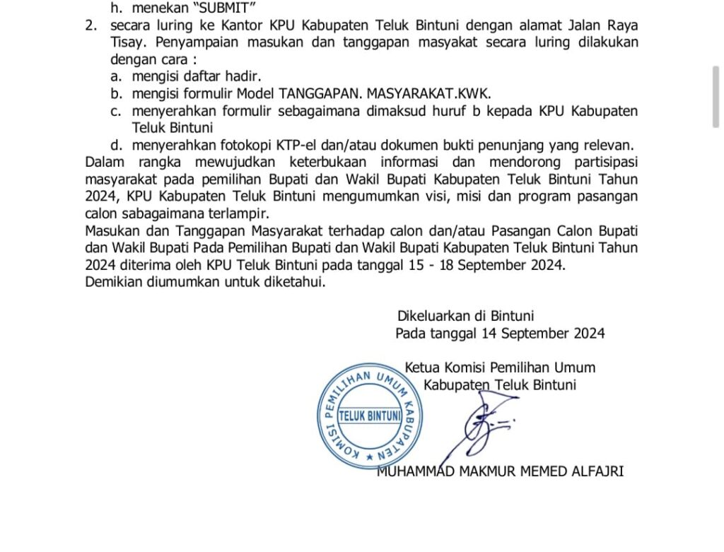 Pengumuman Hasil Penelitian Persyaratan Administrasi Calon Bupati dan Wakil Bupati Dalam Pemilihan Kepala Daerah Kabupaten Teluk Bintuni Tahun 2024