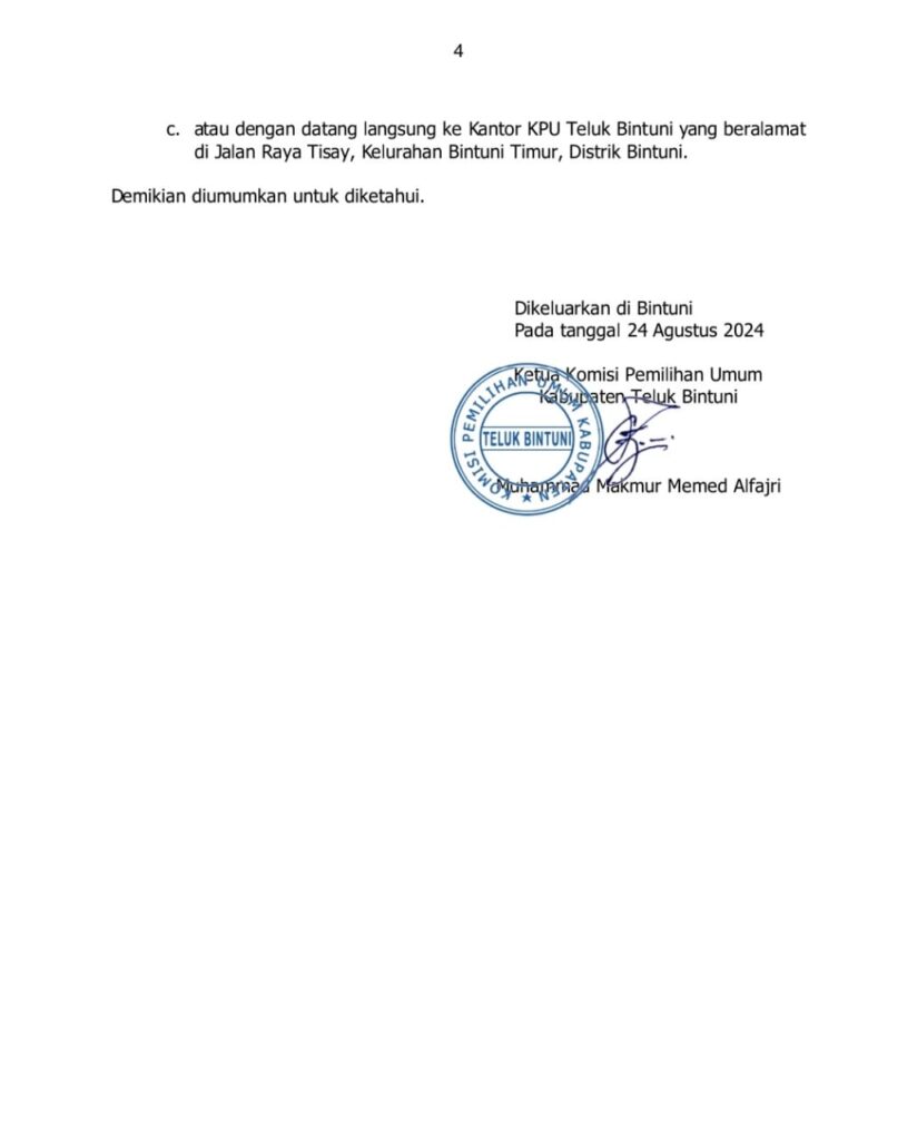 Agustus 27, 2024 Pengumuman Pendaftaran Calon Bupati dan Wakil Bupati Teluk Bintuni Tahun 2024 NEWS 0 Post Views: 302
