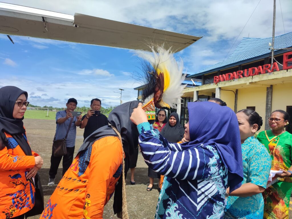Penjemputan Ketua BKOW Ny. Lanny Laisanggi Lakatoni di Bandara Bintuni di sambut dengan pengalungan tas Noken khas Papua oleh Ketua l GOW. Jacomina Jane Awak. Selanjutnya pengalungan mahkota dari Ny. Nurdiana Amir Lingara kepada Ketua BKOW Provinsi Papua Barat Ny. Lanny Laisanggi Lakatoni.