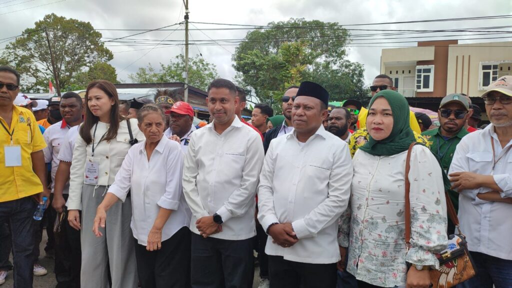 Pasangan Yohanis Manibuy dan Joko Lingara di antar oleh ribuan pendukungnya dari sekretariat pemenangan yang berlokasi di Kampung Lama. (Susi)