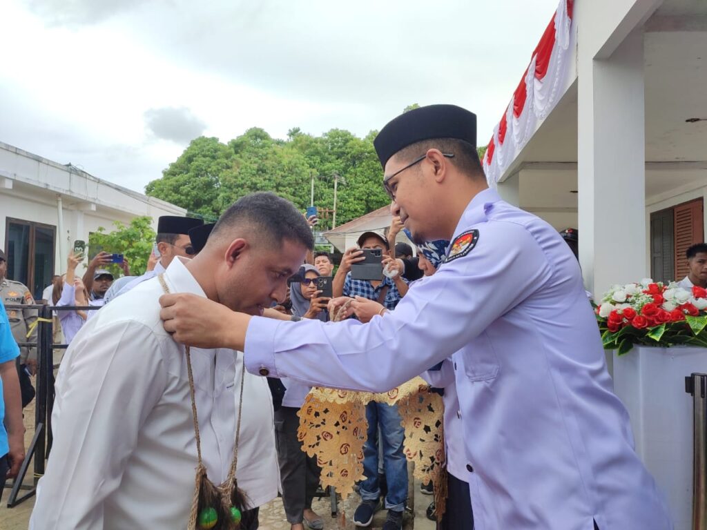 Ketua KPU Teluk Bintuni, Muhammad Makmur Memed Alfajri saat menerima pasangan YO JOIN di depan AULA KPU dengan mengalunkan Noken