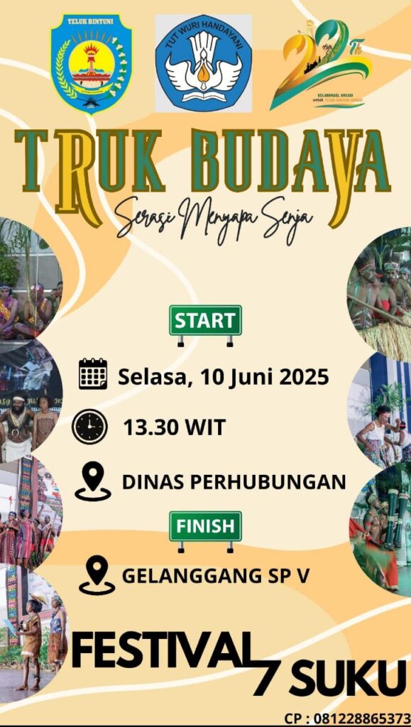 Kegiatan Truk Budaya ini akan di lepas oleh Bupati Yohanis Manibuy, SE.,MH,. Pada Selasa (10/6/2025). Siang. Dengan mengambil titik start dari Dinas Perhubungan dan finish di Gelanggang Argosigemerai SP5. kegiatan ini digelar sebagai upaya melestarikan budaya lokal sekaligus memberikan hiburan kepada masyarakat untuk menyambut HUT ke-22 Kabupaten Teluk Bintuni.
