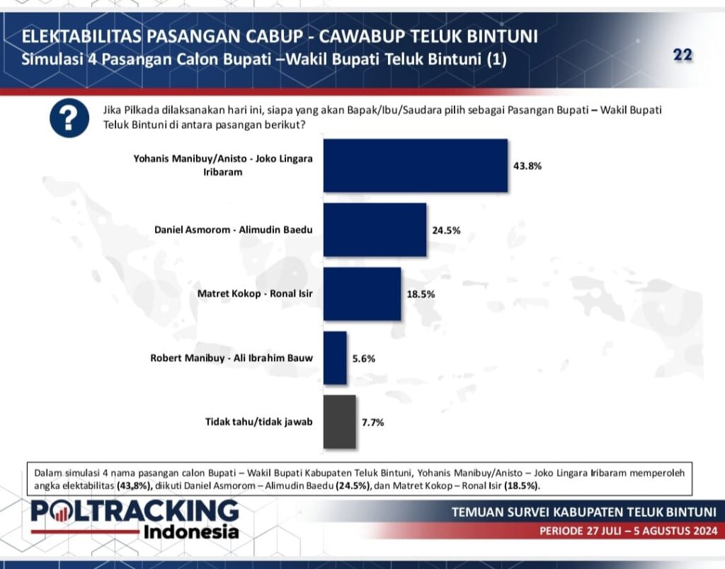Dari data terbaru yang diterima media ini, Poltracking Indonesia melakukan survey pada rentang waktu 27 Juli hingga 5 Agustus 2024. Dari 400 jumlah responden yang dilibatkan dalam survey, sebanyak 43,8 persen memilih paslon YO JOIN. Angka ini mengacu pertanyaan yang disampaikan kepada responden; Jika Pilkada dilaksanakan hari ini, siapa yang akan Bapak/Ibu/Saudara pilih sebagai pasangan Bupati-wakil Bupati Teluk Bintuni di antara pasangan berikut?