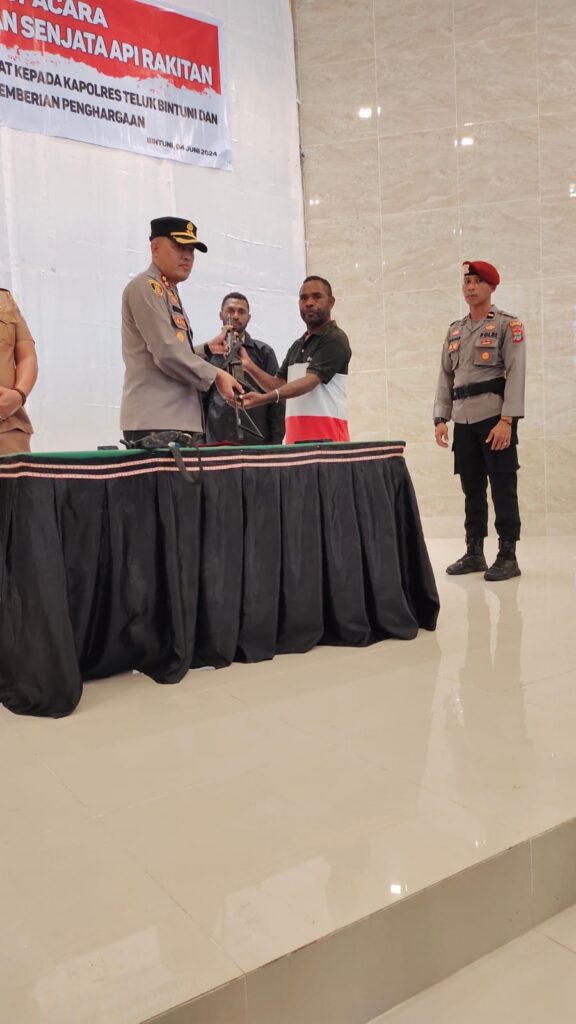 Kapolres Teluk Bintuni AKBP. Choiruddin Wachid dalam jumpa pers menyampaikan apresiasinya terhadap dua warga teluk bintuni yakni Ponti Dowansiba yang secara suka rela menyerahkan senjata api rakitan jenis SS1 beserta amunisi 10 butir kaliber 5,6, sementara Yusuf Hengki Tubes menyerahkan senjata Api rakitan M16 beserta Amunsi 1 Butir kaliber 5,6 mm.